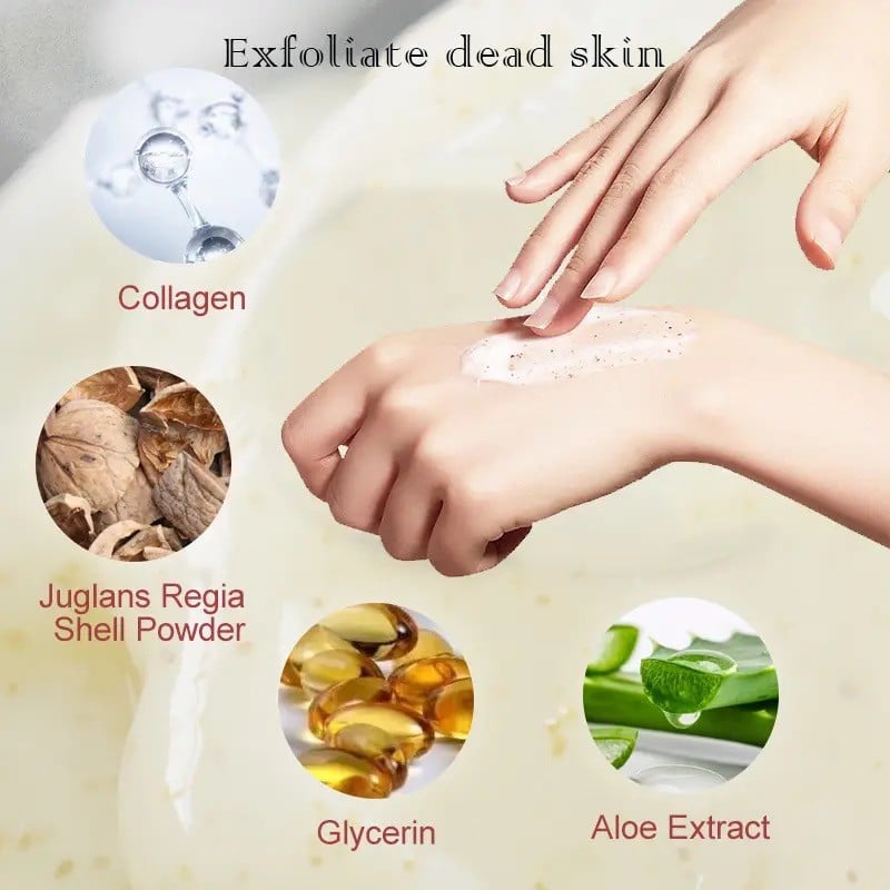 • مقشر الجسم يقشر لازالة الخلايا الميته والتراكمات من المسام كما يزيد التنظيف من تدفق الدم للمساعده في تجديد الخلايا مما يترك جسمك وبشرتك منتعشه طوال اليوم